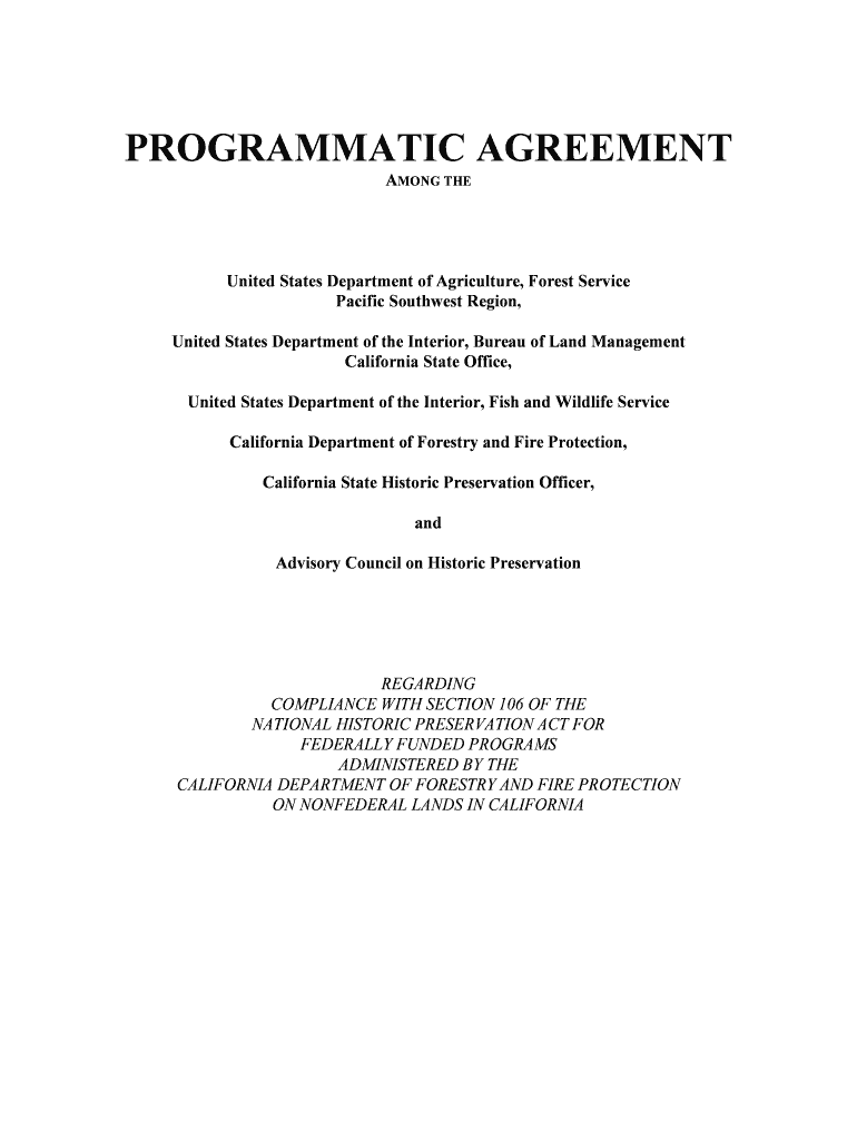 This document outlines the agreements among various federal and state agencies regarding compliance with the National Historic Preservation Act for federally funded programs administered by the California