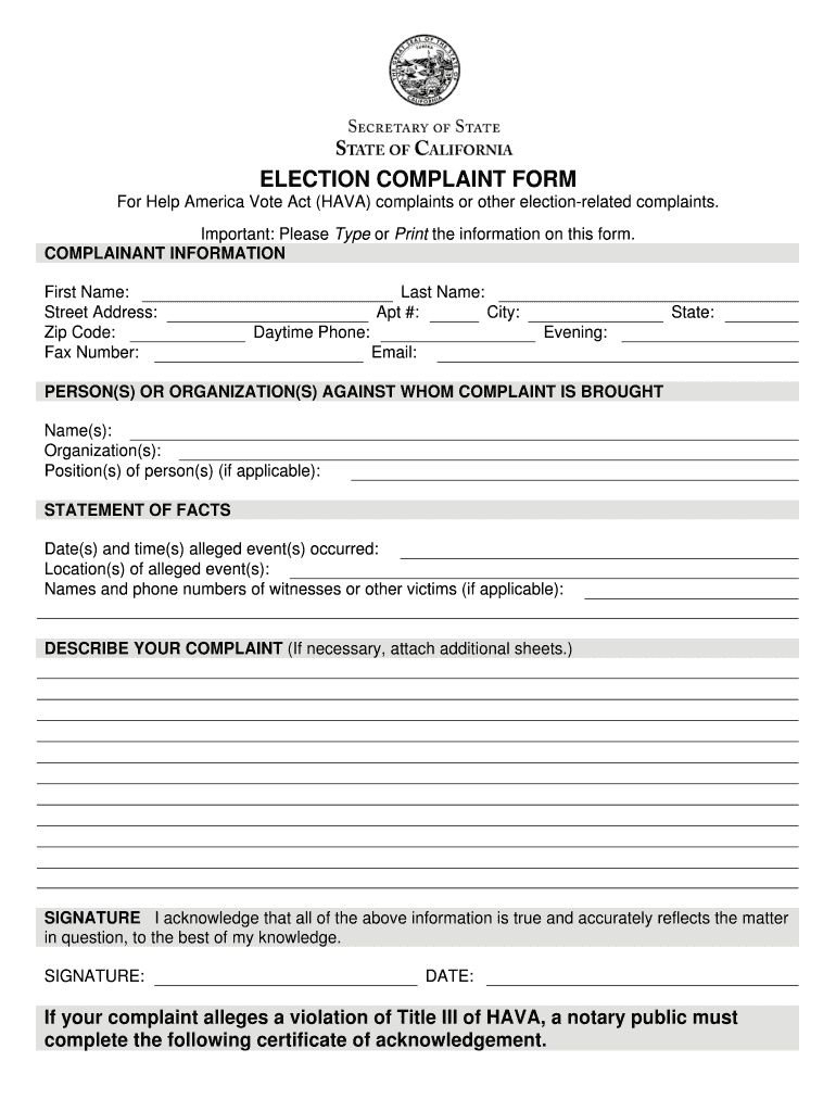 The Election Complaint Form is a legal document used by voters in California to report HAVA (Help America Vote Act) complaints or election-related issues.