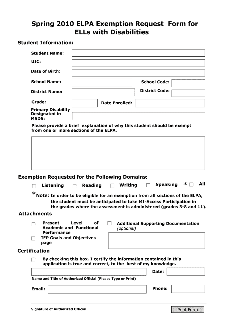 Get the free Michigan ELPA Exemption Request Form