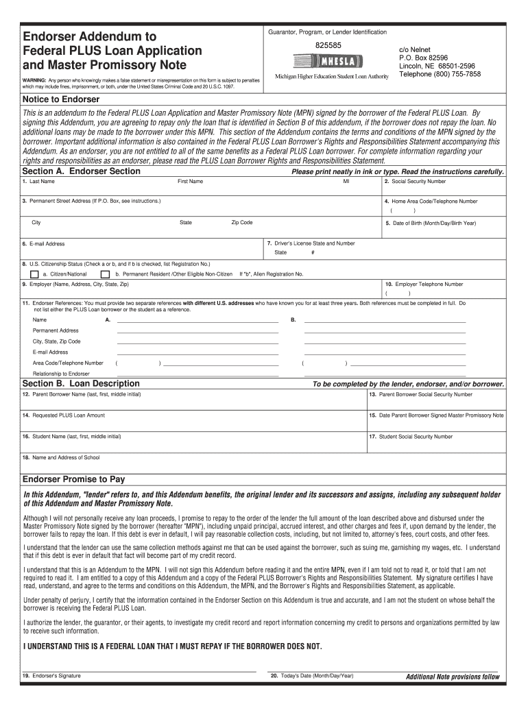 This form, also known as the plus loan endorser form, requires specific personal information from the endorser, including their name, social security number, and address. By signing, the endorser acknowledges their commitment to support the primary borrower financially.