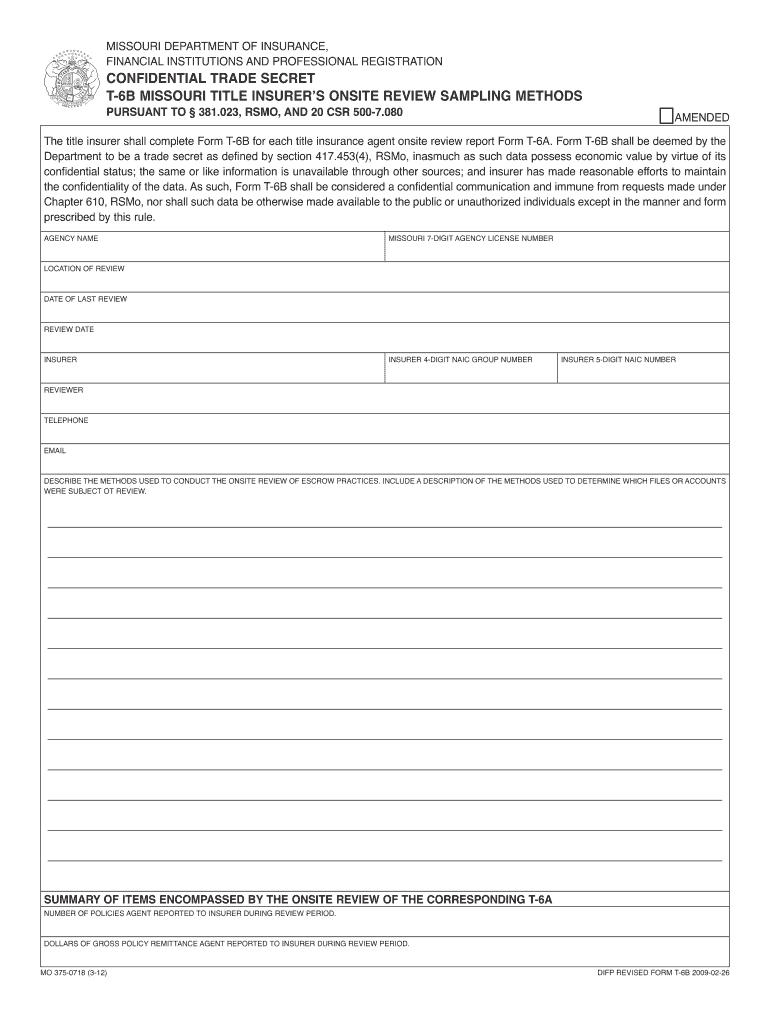 Form T-6B is a document used by title insurers in Missouri to report onsite review sampling methods used during audits and evaluations of their practices.