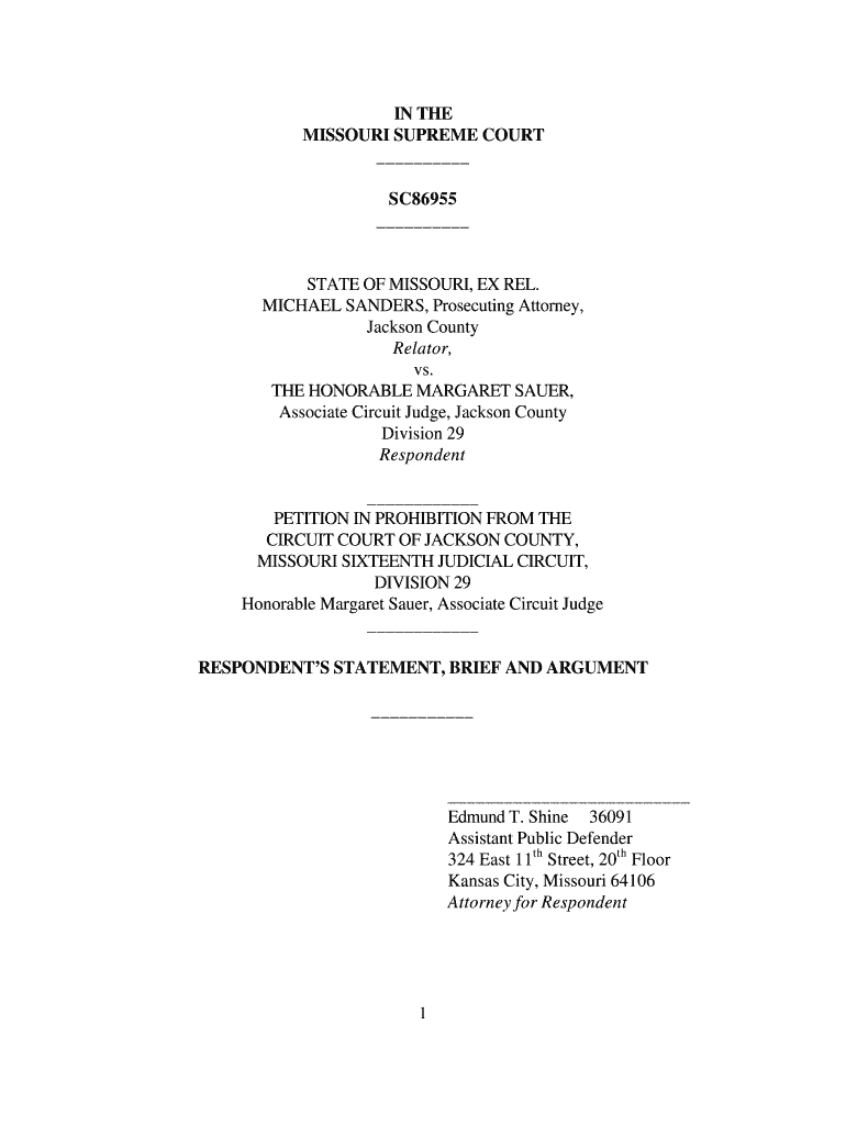 IN THE MISSOURI SUPREME COURT SC86955 STATE OF MISSOURI, EX REL. MICHAEL SANDERS, Prosecuting Attorney, Jackson County Realtor, vs. THE HONORABLE MARGARET SAFER, Associate Circuit Judge, Jackson County