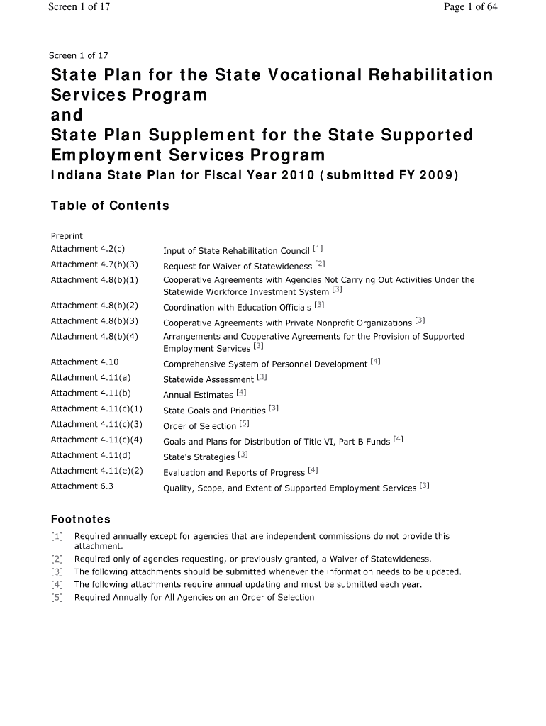 Screen 1 of 17-Page 1 of 64 Screen 1 of 17 State Plan for the State Vocational Rehabilitation Services Program and State Plan Supplement for the State Supported Employment Services Program Indiana
