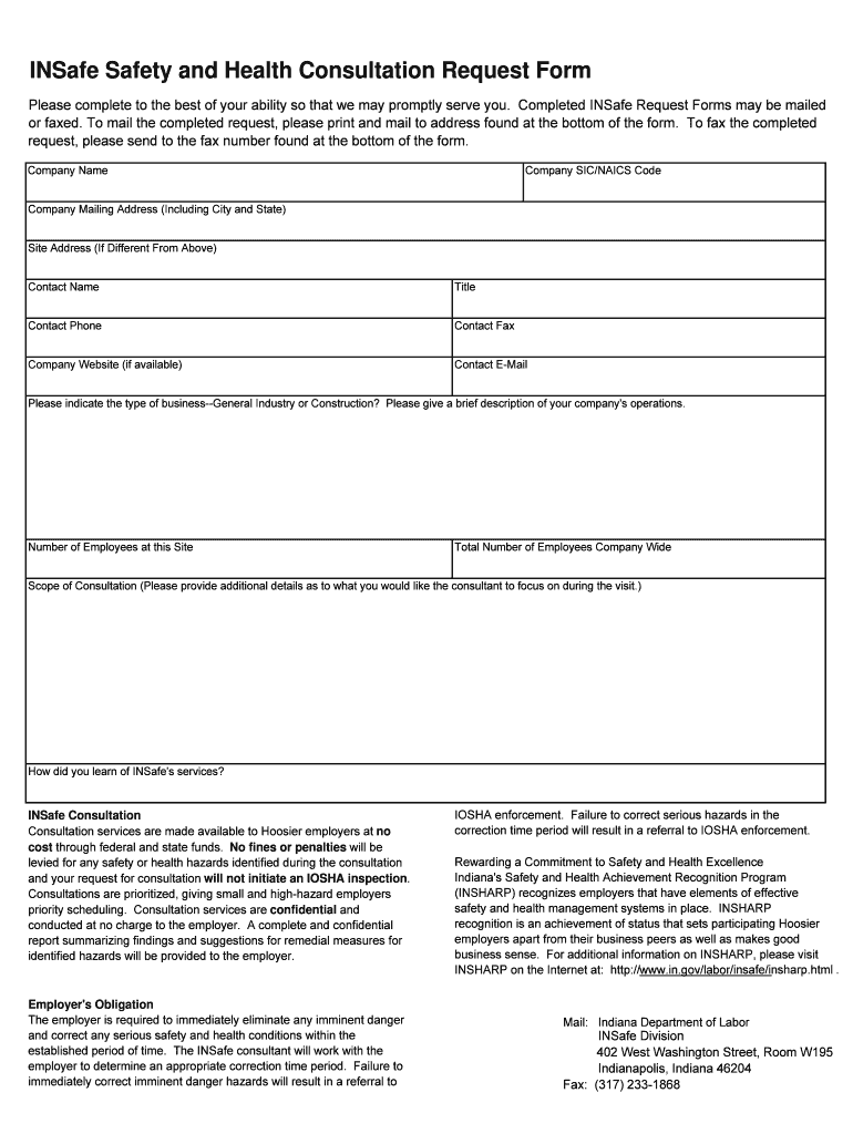 Any employer based in Indiana seeking to improve workplace safety and health conditions can use the INSafe Safety and Health Consultation Request Form.