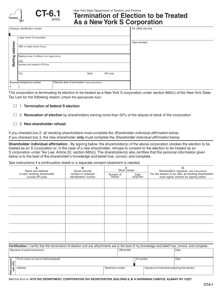 This form is used by corporations in New York State to terminate their election to be treated as S corporations under New York State tax law.