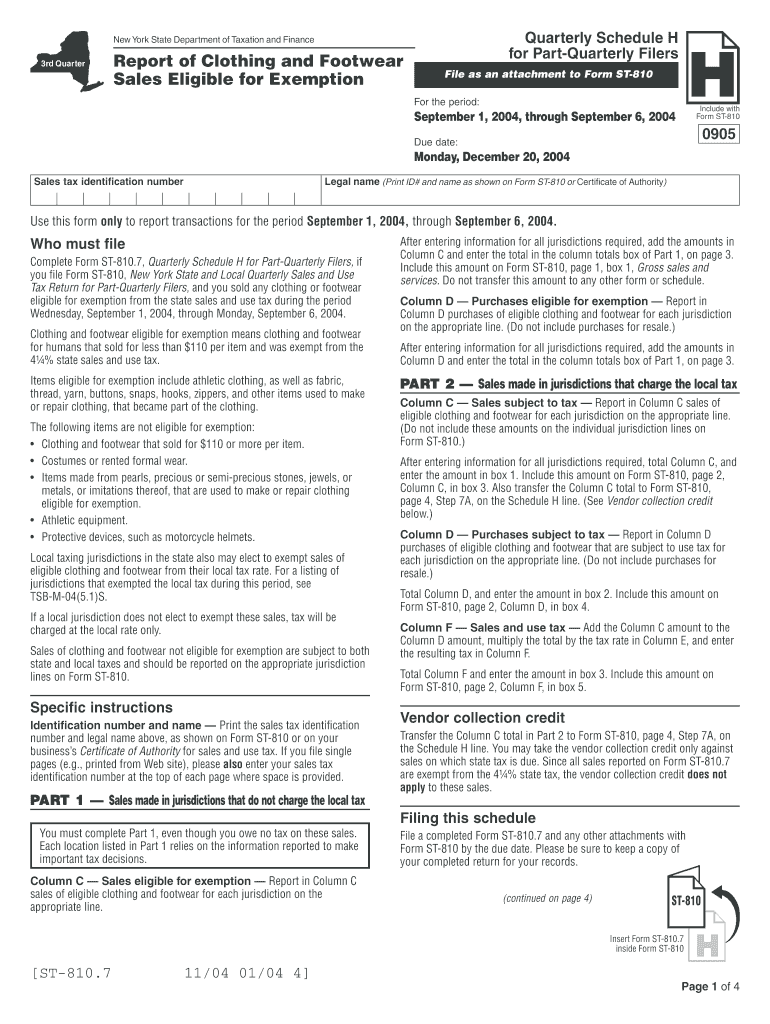 A tax form used to report sales of exempt clothing and footwear for part-quarterly filers in New York State, detailing transactions eligible for exemption from state sales tax.