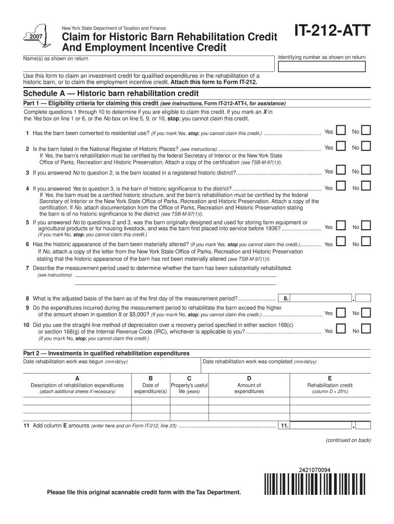 This form is used to claim a credit for qualified expenditures in the rehabilitation of a historic barn and to claim the employment incentive credit in New York State.