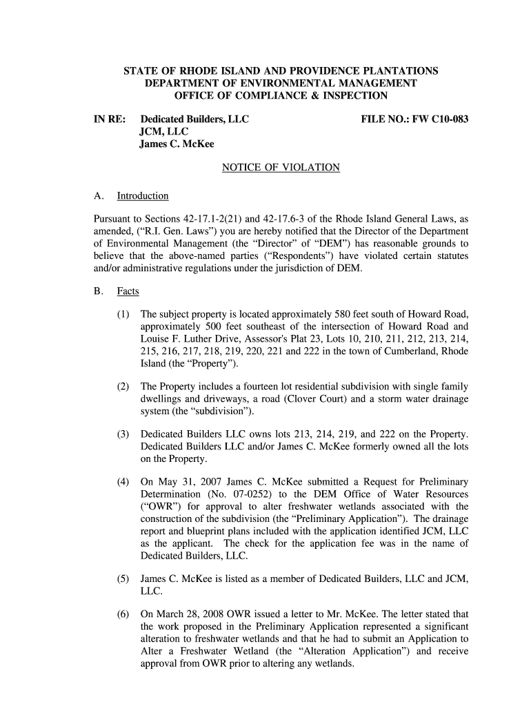 This document serves as a formal notice to Dedicated Builders, LLC, JCM, LLC, and James C. McKee regarding violations of the Rhode Island Freshwater Wetland Act and related statutes, specifying required