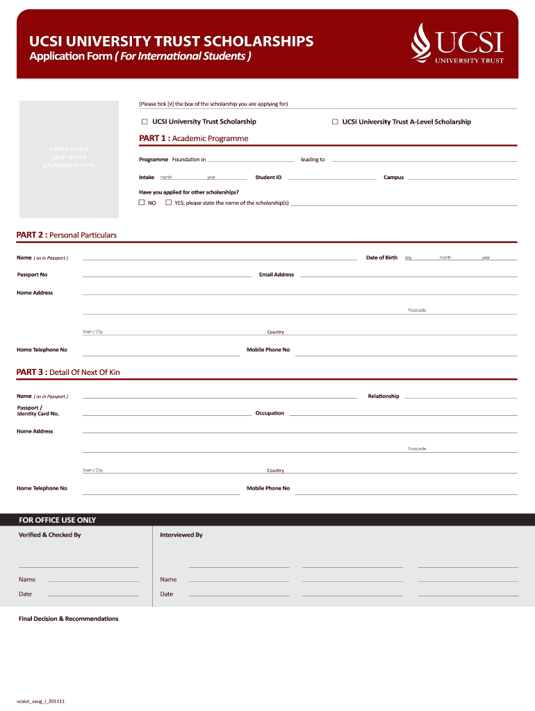 Students who wish to receive financial aid or scholarships to attend UCSI University are required to file the UCSI University Trust Scholarship Application.