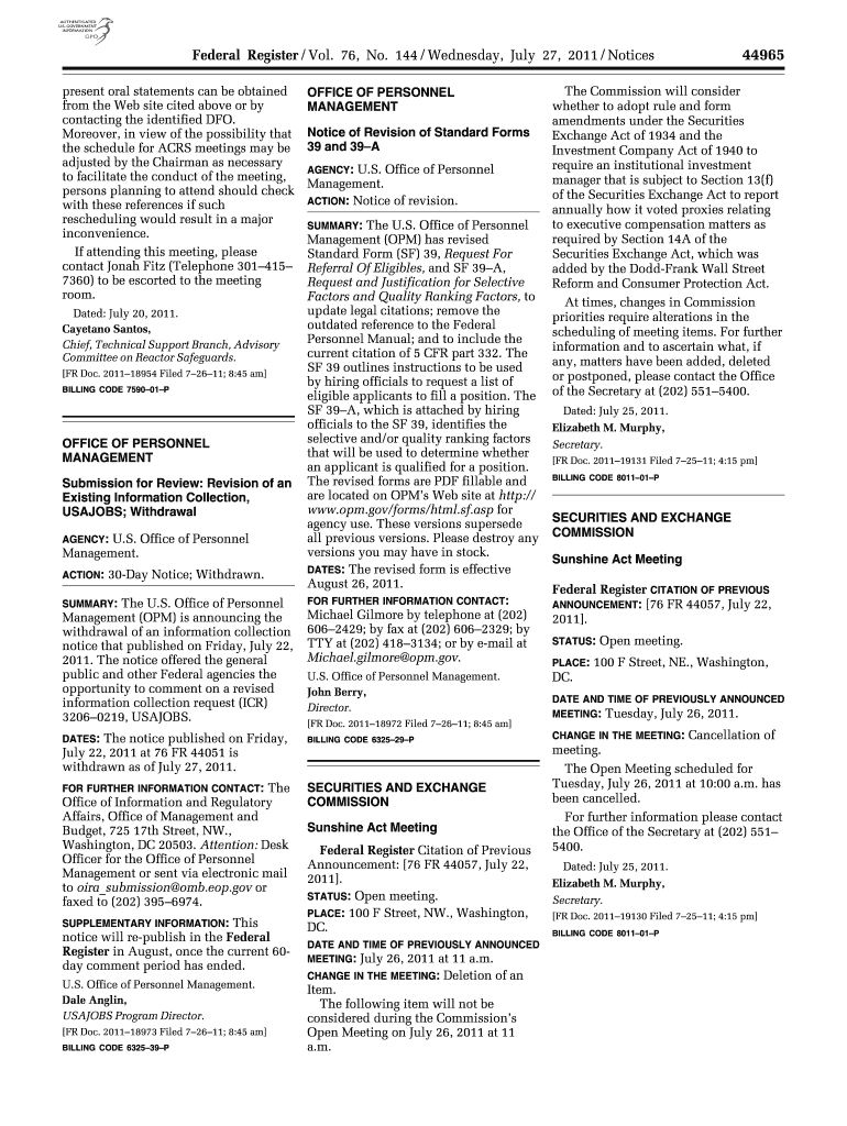 This document includes notices from the U.S. Office of Personnel Management regarding the withdrawal of an information collection notice for USAJOBS, along with revisions to Standard Forms 39 and
