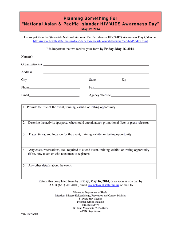 Organizations and individuals who are planning events or activities for the National Asian & Pacific Islander HIV/AIDS Awareness Day are typically required to file this form.