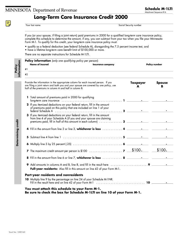 The Minnesota Long-Term Care Insurance Credit Form (Schedule M-1LTI) is a state tax document used by Minnesota residents to determine the eligible credit for long-term care insurance premiums paid in 2000.