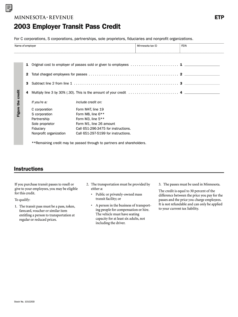 The Minnesota Employer Transit Pass Credit Form, known as the ETP 2003 form, is a state tax document that enables employers to claim a credit for the expenses incurred in providing transit passes to employees. This form is crucial for facilitating tax credits related to transportation benefits in Minnesota. Key elements of the form include essential fields such as the employer's tax ID and the original costs associated with transit passes.
