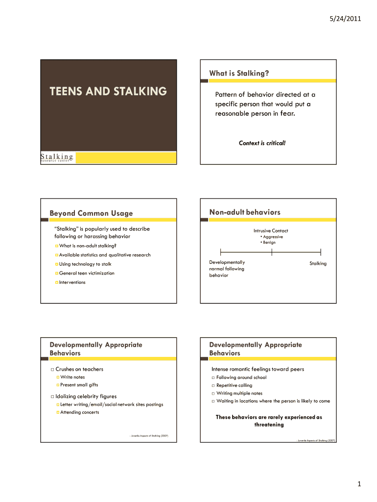 5/24/2011 What is Stalking? TEENS AND STALKING Pattern of behavior directed at a specific person that would put a reasonable person in fear. Context is critical! Beyond Common Usage Stalk g” is