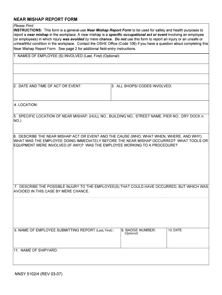 All employees who experience or witness a near mishap at the workplace are required to fill out the Near Mishap Report Form.