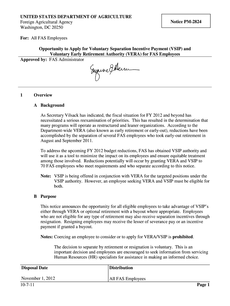 This document provides information regarding the Voluntary Separation Incentive Payment (VSIP) and the Voluntary Early Retirement Authority (VERA) available to employees of the Foreign Agricultural