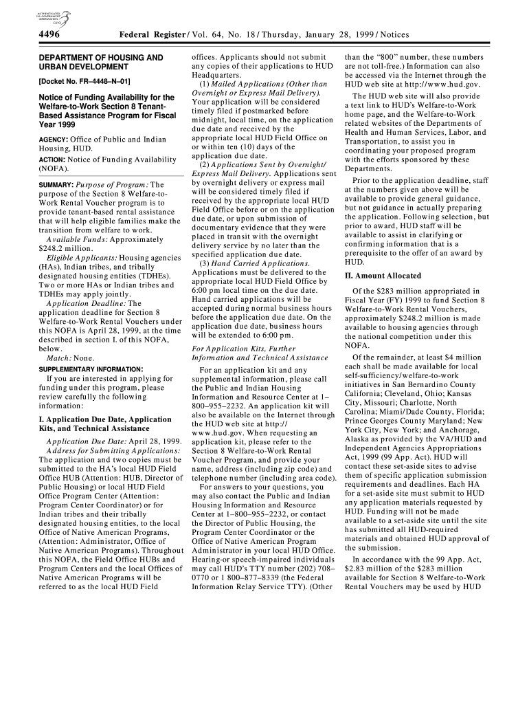 The Notice of Funding Availability (NOFA) for the Welfare-to-Work Section 8 Tenant-Based Assistance Program for Fiscal Year 1999 is a formal announcement issued by the U.S. Department of Housing and Urban Development (HUD) that outlines the availability of federal funding for programs intended to assist low-income individuals in finding employment and self-sufficiency through housing assistance.