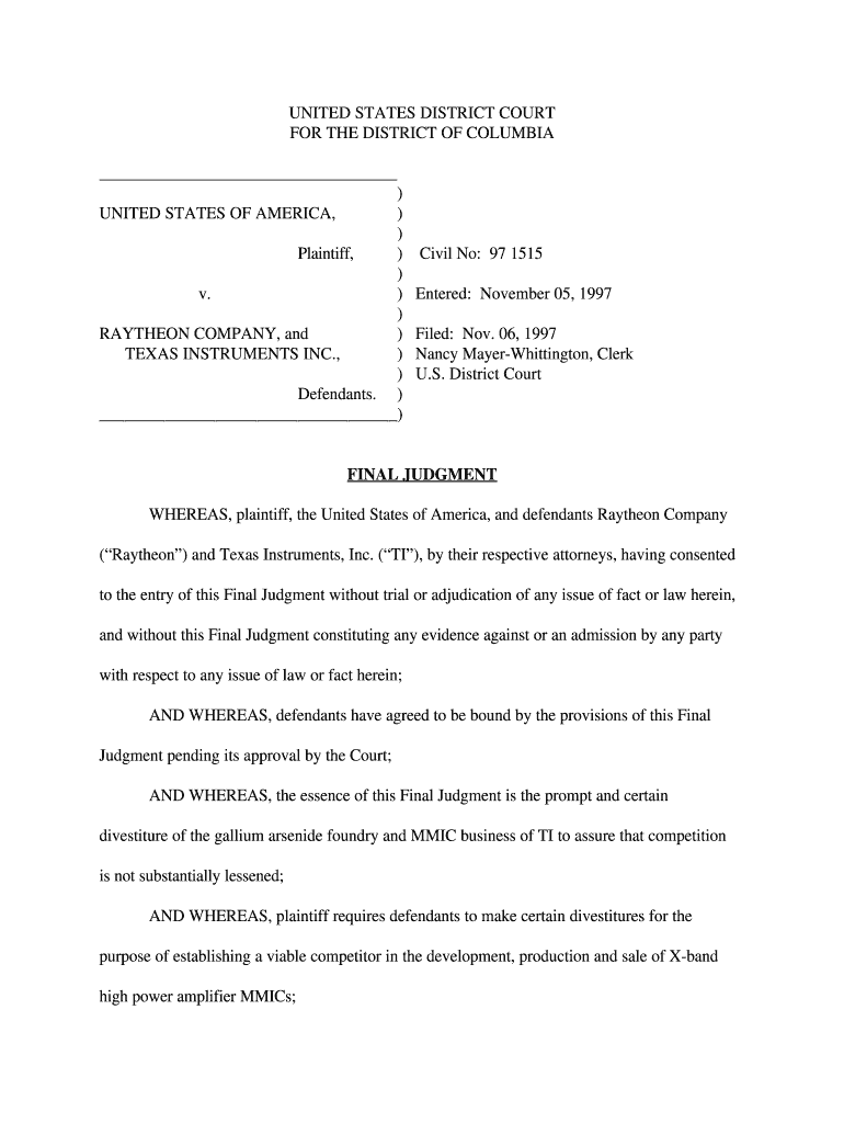 UNITED STATES DISTRICT COURT FOR THE DISTRICT OF COLUMBIA) UNITED STATES OF AMERICA,) ) Plaintiff,) ) v.) ) RAYTHEON COMPANY, and) TEXAS INSTRUMENTS INC.,) ) Defendants. )) Civil No: 97 1515 Entered: