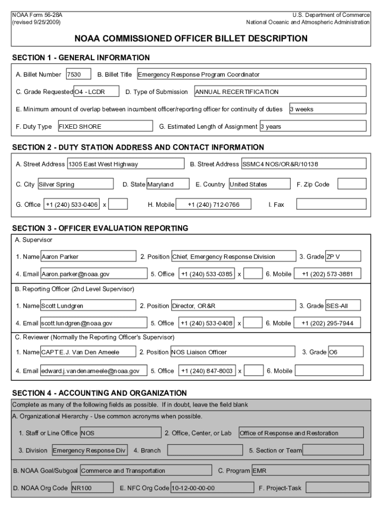 This form serves to describe the duties and responsibilities of the Emergency Response Program Coordinator within the NOAA's Office of Response and Restoration, focusing on disaster preparedness and