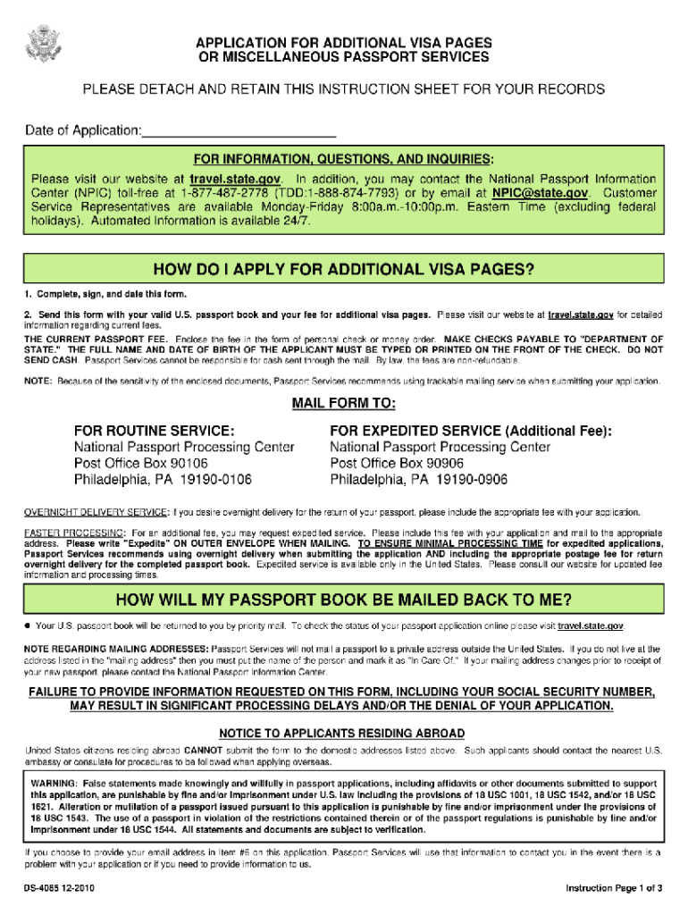 APPLICATION FOR ADDITIONAL VISA PAGES OR MISCELLANEOUS PASSPORT SERVICES PLEASE DETACH AND RETAIN THIS INSTRUCTION SHEET FOR YOUR RECORDS Date of Application: FOR INFORMATION, QUESTIONS, AND INQUIRIES: