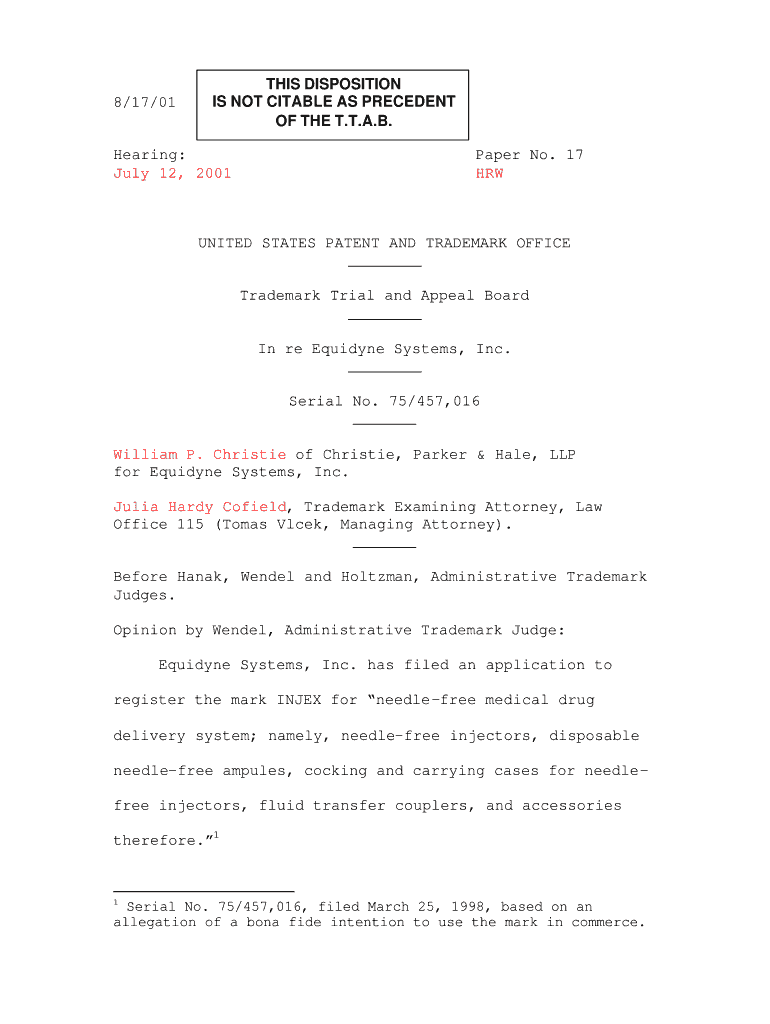 Get the free 8/17/01 THIS DISPOSITION IS NOT CITABLE AS PRECEDENT OF THE T - uspto