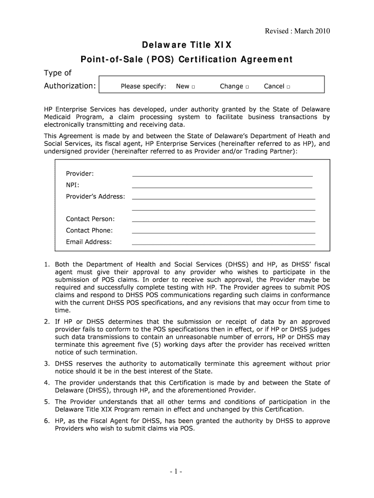 Get the free Delaware Title XIX Point-of-Sale (POS) Certification Agreement