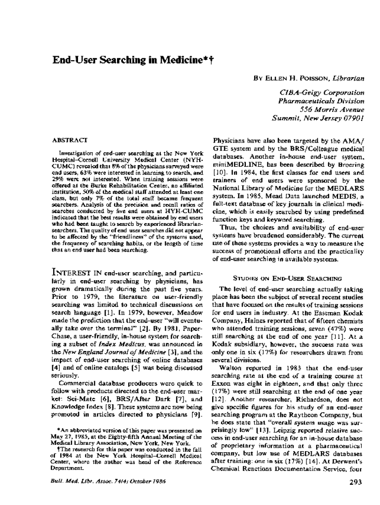 Endured Searching in Medicine’t BY ELLEN H. POISSON, LibrarianCIBAGeigy Corporation Pharmaceuticals Division 556 Morris Avenue Summit, New Jersey 07901 ABSTRACTInvestigation of end user searching