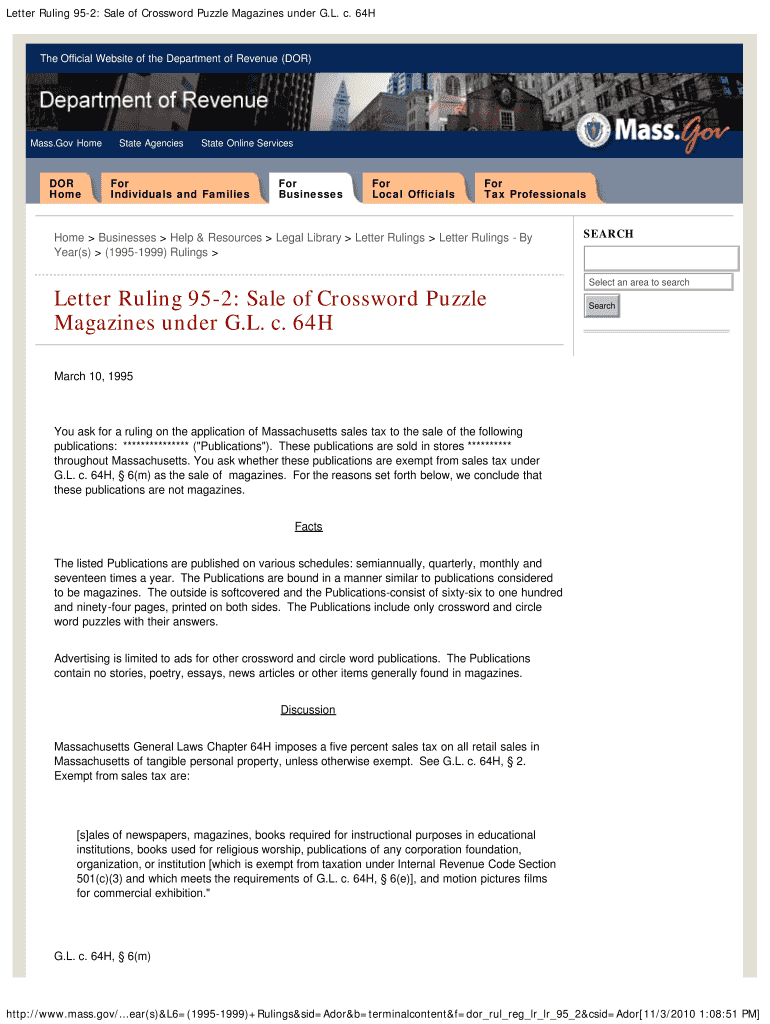 Letter Ruling 95-2: Sale of Crossword Puzzle Magazines under G.L. c. 64H The Official Website of the Department of Revenue (FOR) Mass. Gov Home FOR Home State Agencies State Online Services For Individuals