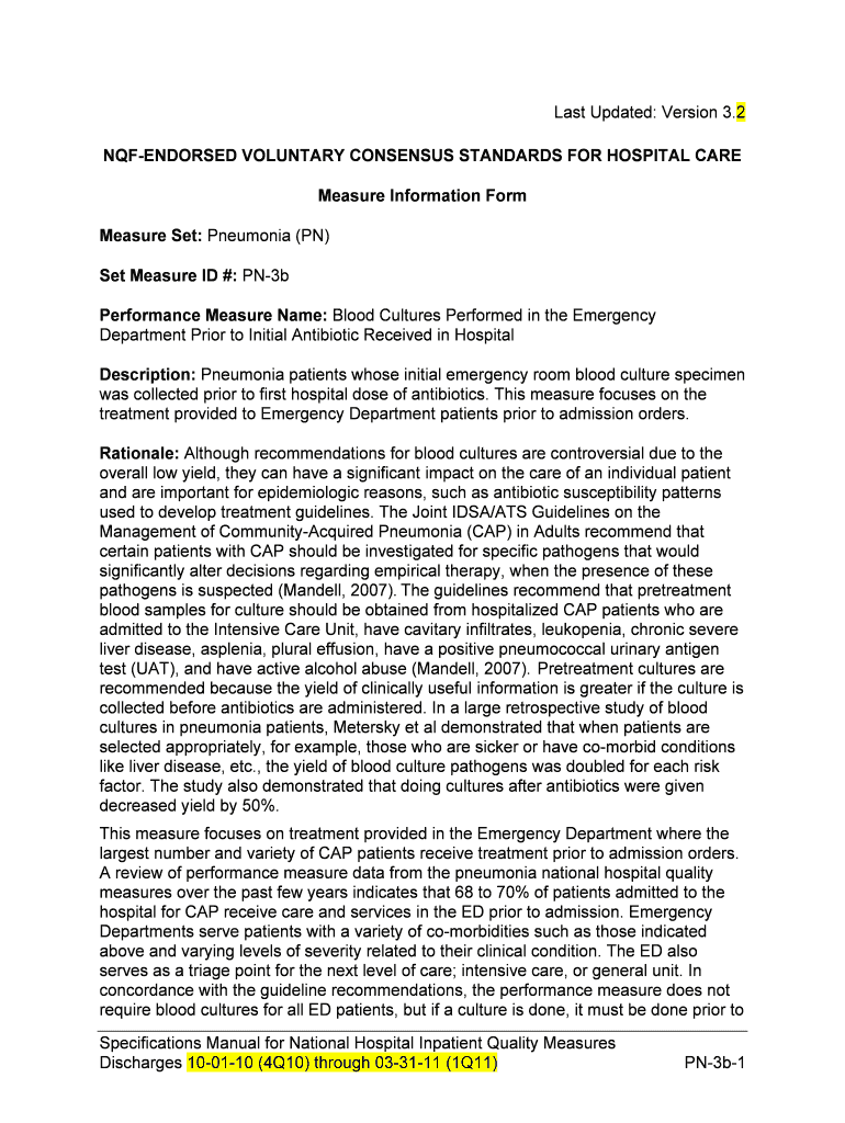 This document details the performance measure for Blood Cultures performed in the Emergency Department prior to the initial antibiotic dose for pneumonia patients, focusing on treatment protocols
