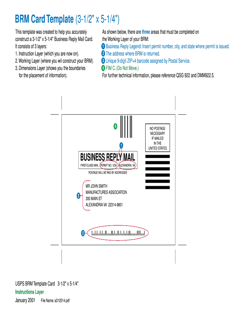 This template provides instructions and dimensions for constructing a Business Reply Mail Card of specified size, including areas for required information and technical guidelines.