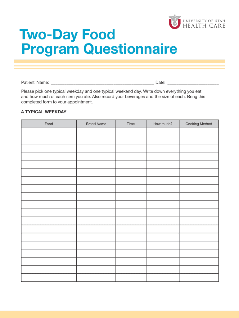 The Two-Day Food Program Questionnaire is a medical history form used by patients to document their food and beverage intake over two typical days for nutritional assessment.