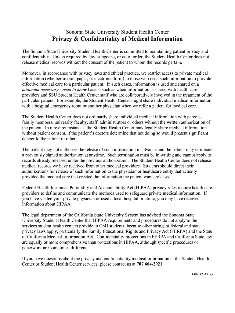 Sonoma State University Student Health CenterPrivacy & Confidentiality of Medical Information The Sonoma State University Student Health Center is committed to maintaining patient privacy and confidentiality.