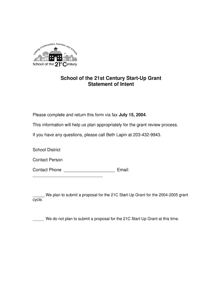 How to fill out School of the 21st Century Start-Up Grant Statement of Intent