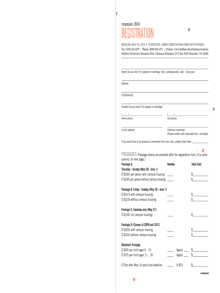 This document serves as a registration form for the Hollins University Reunion 2014, including details about events, meals, accommodations, and optional activities.