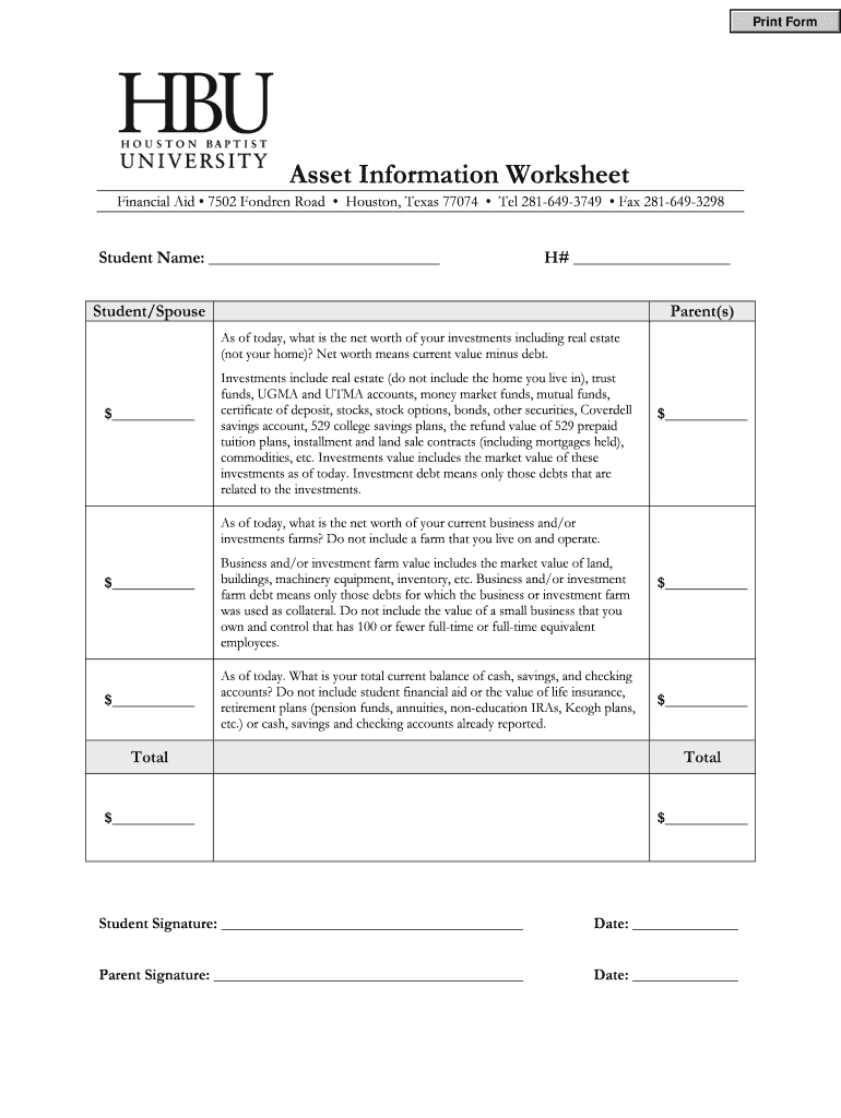 The Financial Aid Asset Information Worksheet serves as a crucial document for students and parents, designed to report the net worth of various assets, including investments and business accounts, essential for determining financial aid eligibility. Accurately reporting these assets is vital, as it directly influences the financial aid available to students. It is essential that both students and parents complete and sign this form for the application to be valid and properly processed.