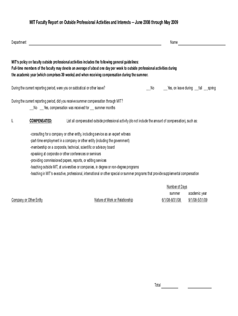 The MIT Faculty Report on Outside Professional Activities is a document designed for faculty members at the Massachusetts Institute of Technology. Its primary purpose is to inform the institution about faculty members' outside professional activities and financial interests. Faculty required to complete the report are those engaged in external work related to their professional expertise for a specific academic year.