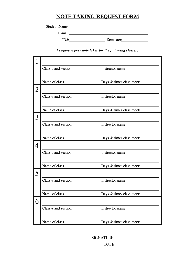 Students or participants who require assistance with note-taking due to disabilities, learning difficulties, or other valid reasons are required to file the Note taking Request form.