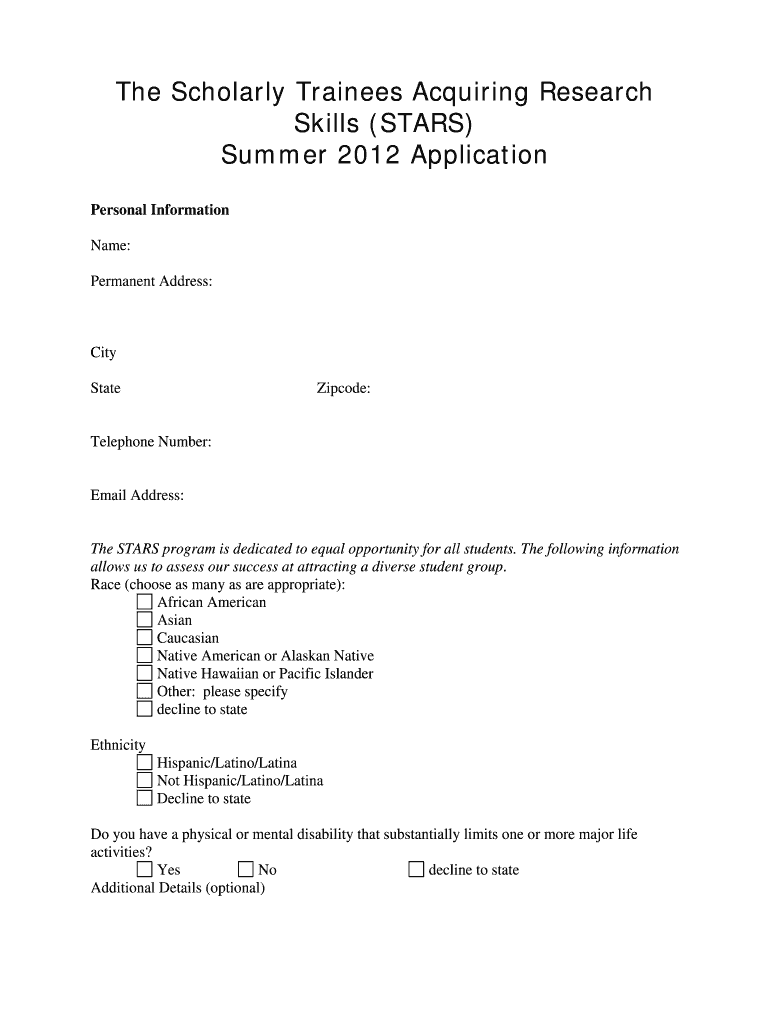 How to fill out Scholarly Trainees Acquiring Research Skills (STARS) Summer 2012 Application?