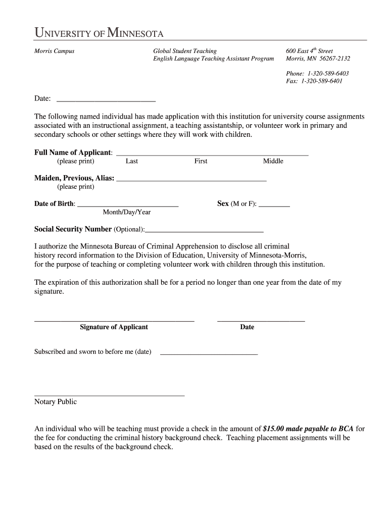 Application form for individuals seeking to participate in the Global Student Teaching English Language Teaching Assistant Program at the University of Minnesota, includes authorization for a criminal