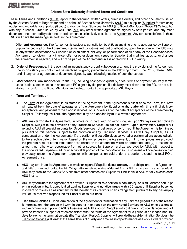 Visit the Arizona State University website and locate the Standard Terms and Conditions document.