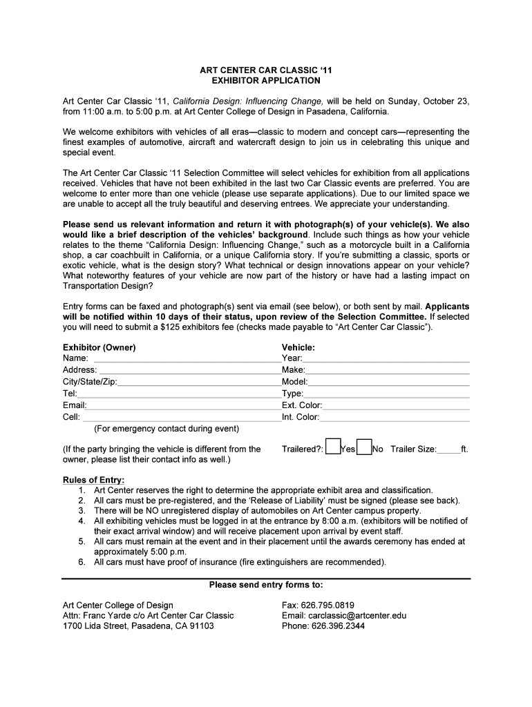 All exhibitors wishing to display their vehicles at the Art Center Car Classic event are required to file the Art Center Car Classic 11 Exhibitor Application.