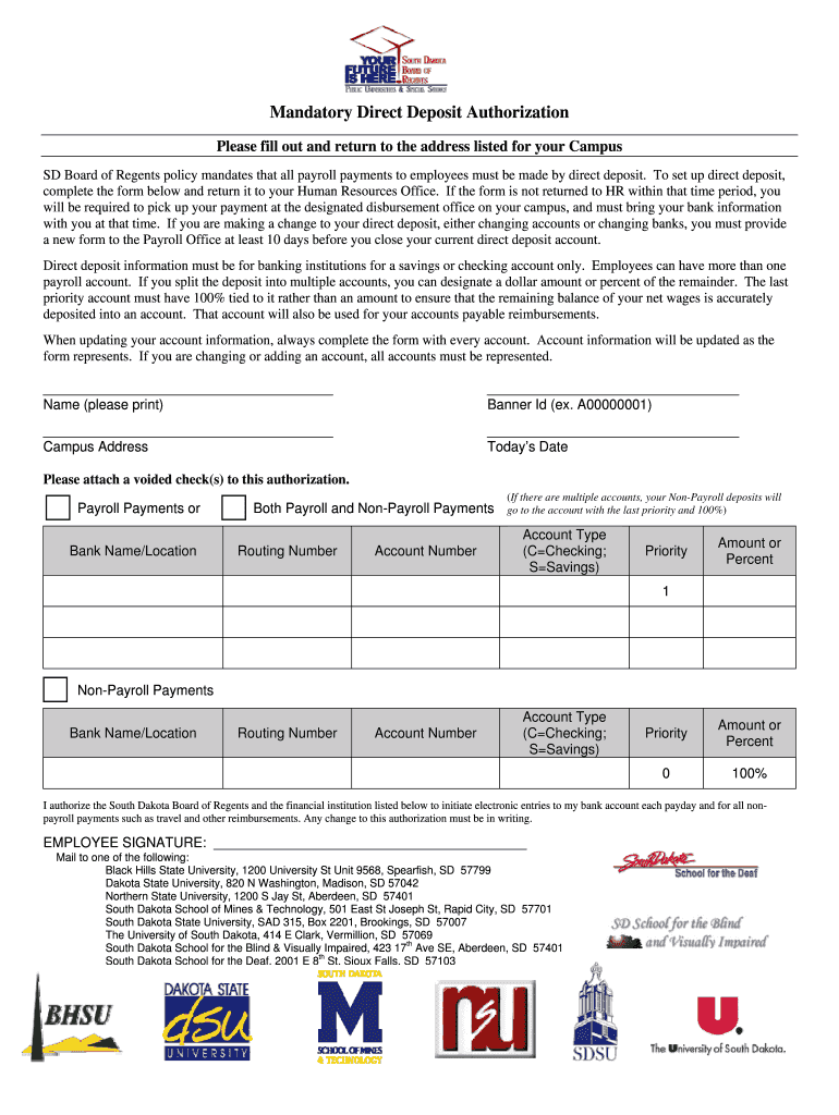 This document is used to authorize direct deposit for payroll payments and other financial transactions to specific bank accounts as required by the South Dakota Board of Regents policy.