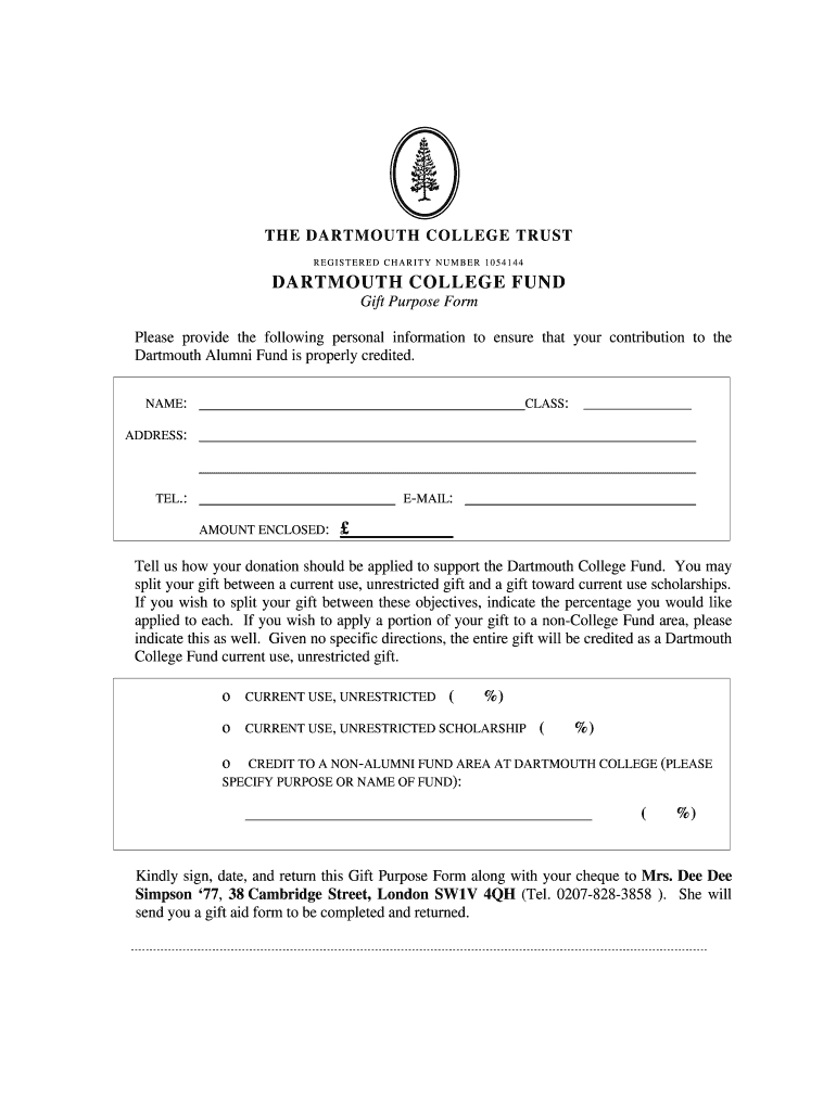 Get the free Dartmouth College Fund Gift Purpose Form - dartmouth
