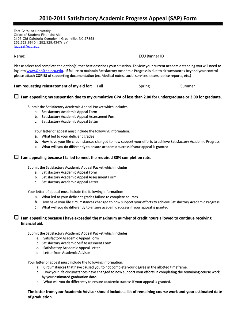 Get the free 2010‐2011 Satisfactory Academic Progress Appeal (SAP) Procedures - ecu