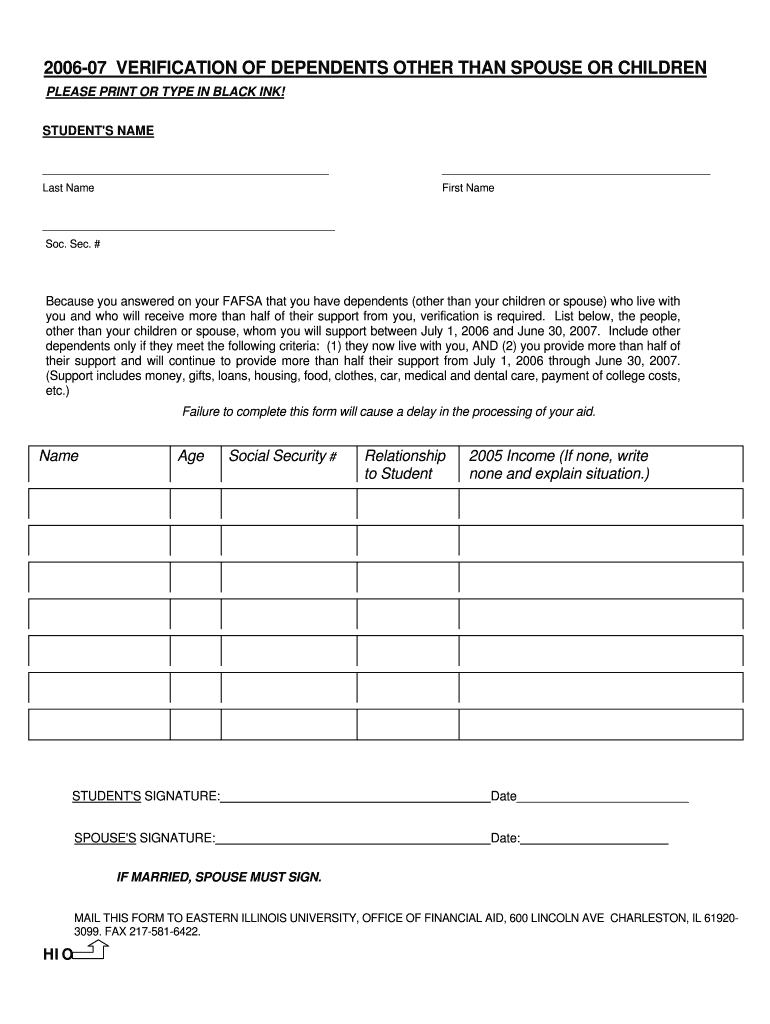 Get the free 2006-07 Verification of Dependents Other Than Spouse or Children - eiu