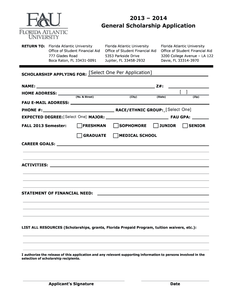 The General Scholarship Application is a scholarship application form used by students at Florida Atlantic University to apply for financial aid and scholarships.