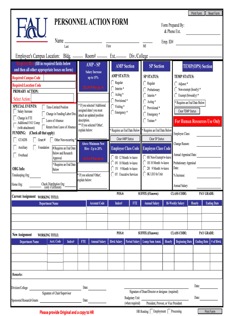 Print Form PERSONNEL ACTION FORM Name Employee's Campus Location: Bldg. Required Box (fill in required fields below and then all other appropriate boxes on form) Required:Campus Code Required:Location