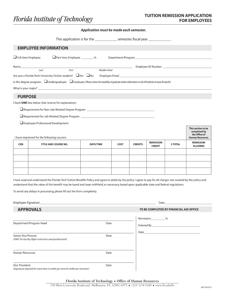 This document serves as an application for employees of Florida Tech seeking tuition remission for courses in either job-related or non-job-related degree programs, or for professional development.