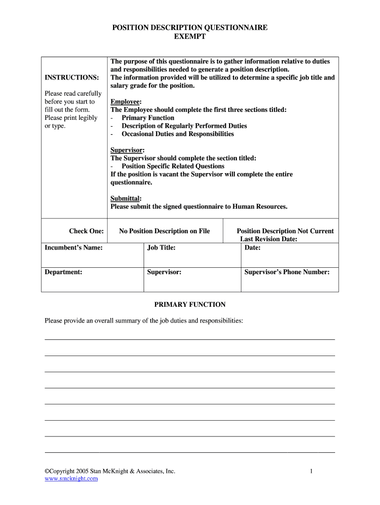 Several key elements make up the Position Description Questionnaire. The form includes distinct sections such as: