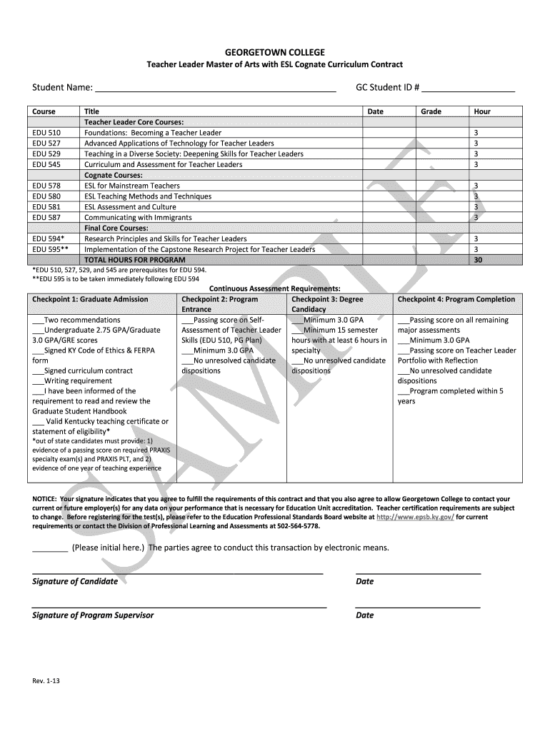 This document outlines the curriculum contract for students enrolled in the Teacher Leader Master's program with an ESL cognate at Georgetown College, detailing course requirements, checkpoints for